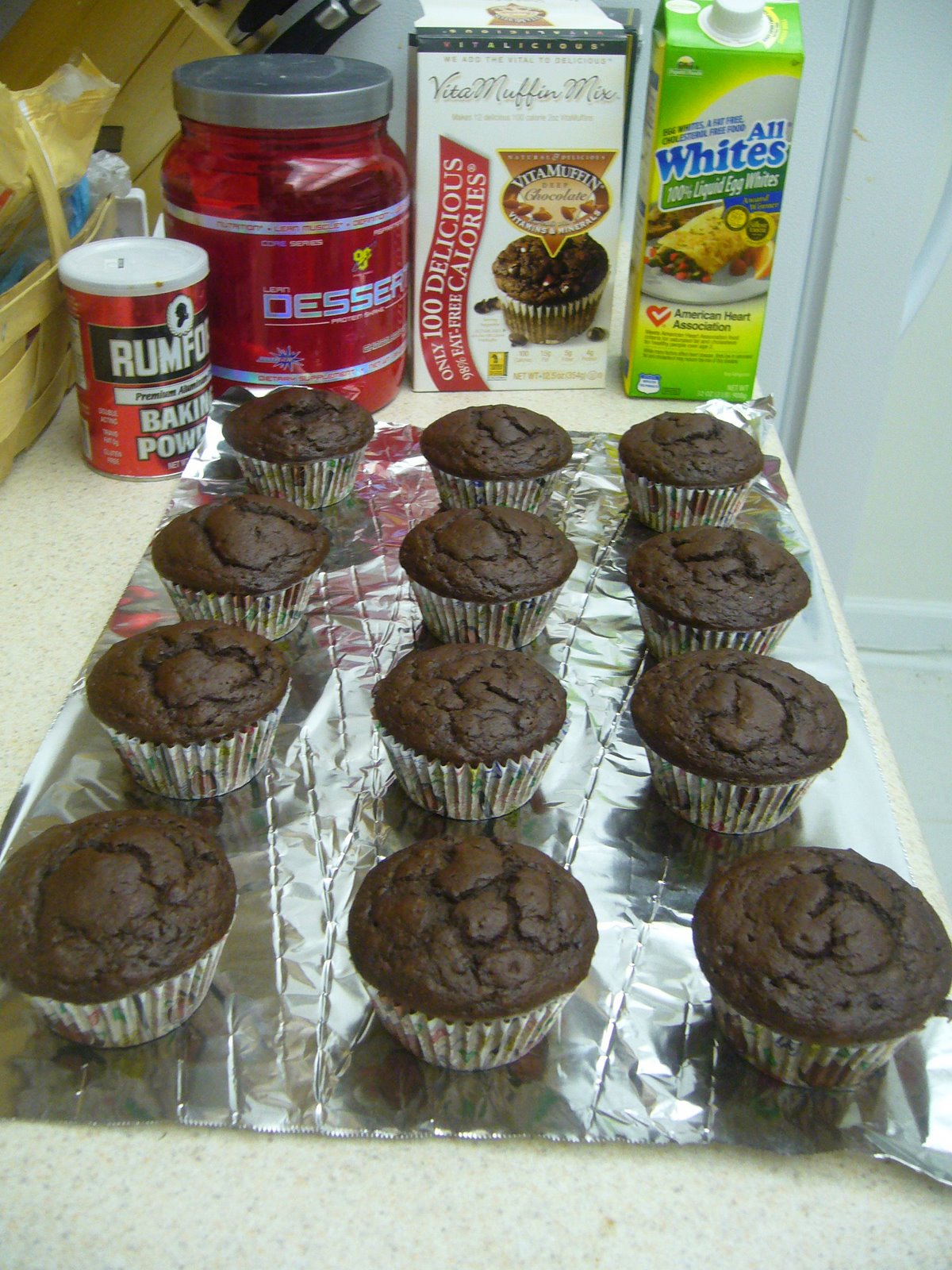 Here’s a warm batch of my Vita-Protein Cupcakes with the necessary ingredients in the background.