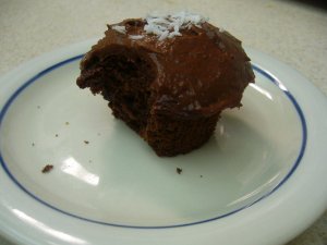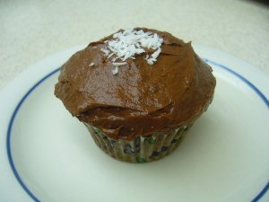 Combine 1 oz. light cream cheese, 1/2 tsp. vanilla, 1 tsp. cocoa powder, and 1/2 of a small package of sugar-free chocolate pudding powder in a food processor. While processing, slowly add milk until the frosting reaches the consistency you like. I used about 1/4 cup of skim milk in mine. If you want a fluffier frosting, fold in a few spoonfuls of cool-whip free. Personally, I like my frosting thick and creamy. Tonight, I also added a pinch of unsweetened coconut to the top of one.