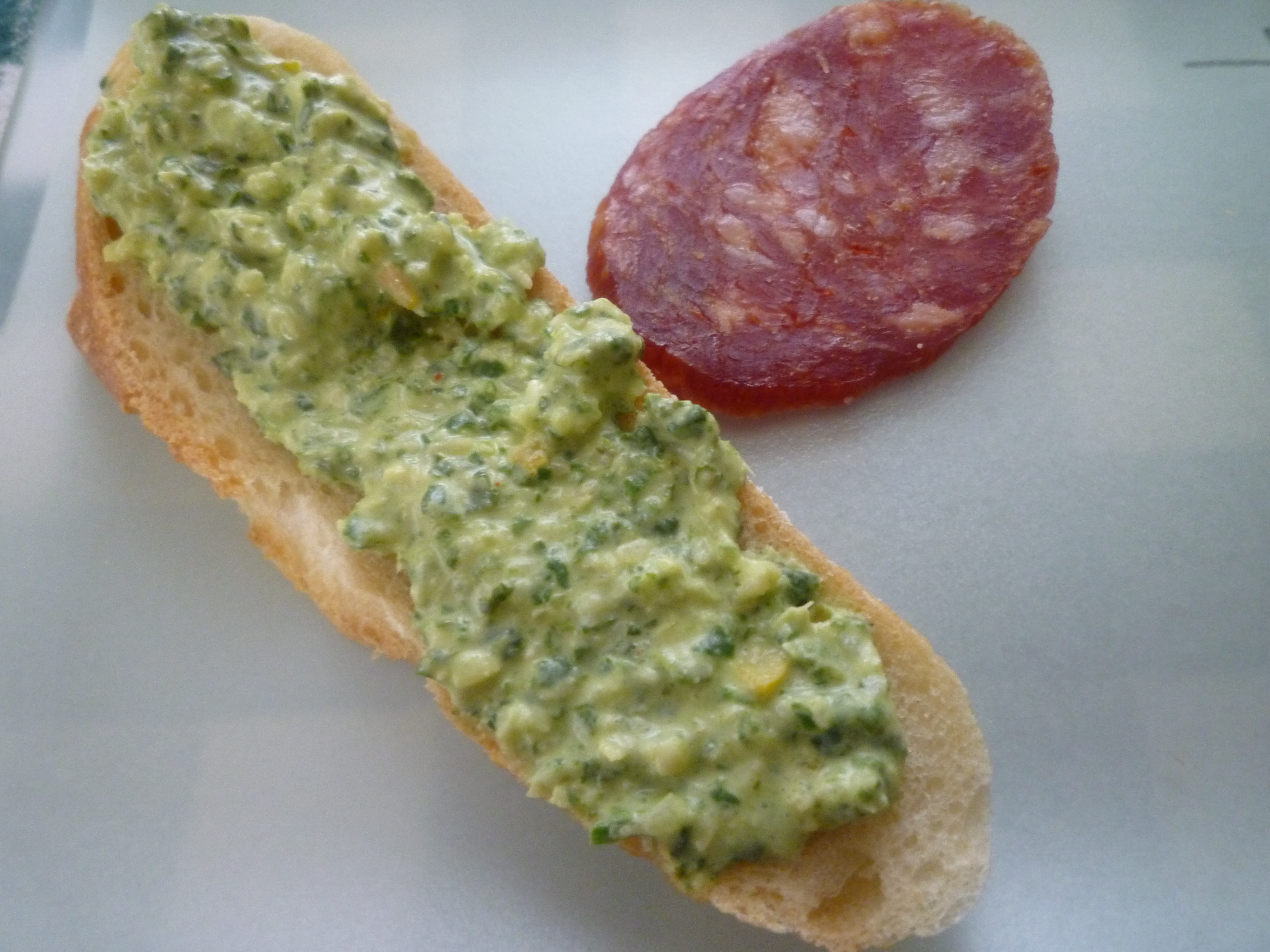 Top each toasted baguette slice with the spread and serve at room temperature. We had ours with some thin-sliced hot soppressata on the side. In the summer, I serve it as a chilled dip alongside raw carrot slices for a cool appetizer.